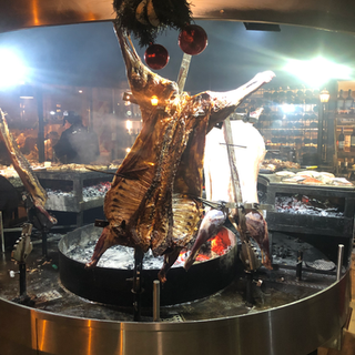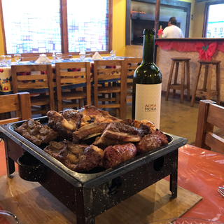 In addition to booking our national park bus, we also spent time planning out a camping trip in El Chalten (including renting camping equipment to be delivered in a couple of days), other transportation, etc. To stave off the hunger during the day we, of course, found more cheap empanadas. After our day in town, we walked back to our hostel and got ready to go out, as it was New Year's Eve! We decided to splurge on eating at a parilla for the special occasion. After we dressed up, we wandered back into town and poked our head into some of the best looking restaurants which had chanchos (pigs) and cabros (goats) roasting on spits. Although it was already ~9:30 at night, and most of the restaurants were empty, none of the parillas had a place for us. We thought it might have been because we were gringos, but in reality these places were reserved for the much-later-eating Argentine crowd, which must eat even later on holidays! We went off the beaten path and finally found a place that could get us a table (by now it was 10:30 pm, the place only had one other family eating, and they still put us in an odd table near the service counter). There were no prices on the menu, the waitress didn't speak English, and the whole place was filled with smoke from the attached asado grill that was, apparently, not well ventilated. We LOVED it and simply could not have had a more wonderful experience for New Year's eve dinner. The chef/grillmaster, who the waitress kept "well-oiled" with timely beer refills, was a perfectionist who handpicked cuts of meat served to each table. We were brought a bursting platter with beef, pork, chicken, sausages, and sweetbreads (cooked non-meat tissue portions of the animal). By the time we left at 11:30 (also well-oiled from the wine), other families were FINALLY showing up for dinner. We finished the night counting down to the new year at the Patagonia Brewing Co brewery with some new beers! Another note: even some of the stray dogs from the street came in for some pets and partying...