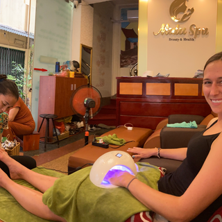 The next day we retraced our steps at each market to hit all of the best deals. We knocked out our shopping early so that we could check out and have a relaxing afternoon as we waited for our evening flight to Ho Chi Minh City. The bargaining was a blast at each place, and we even had a whole row of vendors laughing at Kyle for his proposed price…before they agreed to it as we walked away. We were kicked out of almost every shoe shop we walked into, pretty much immediately, as they did not carry anything close to Kyle’s American foot size. We tried some new fruits (rambutans). We then got massages and pedicures (for a total of around $30) and finished off with our last Vietnamese meal at Bun Cha Huong Lien, a place made famous when president Obama and Anthony Bourdain ate there a few years ago. They even put a glass case around the table that they ate at!
